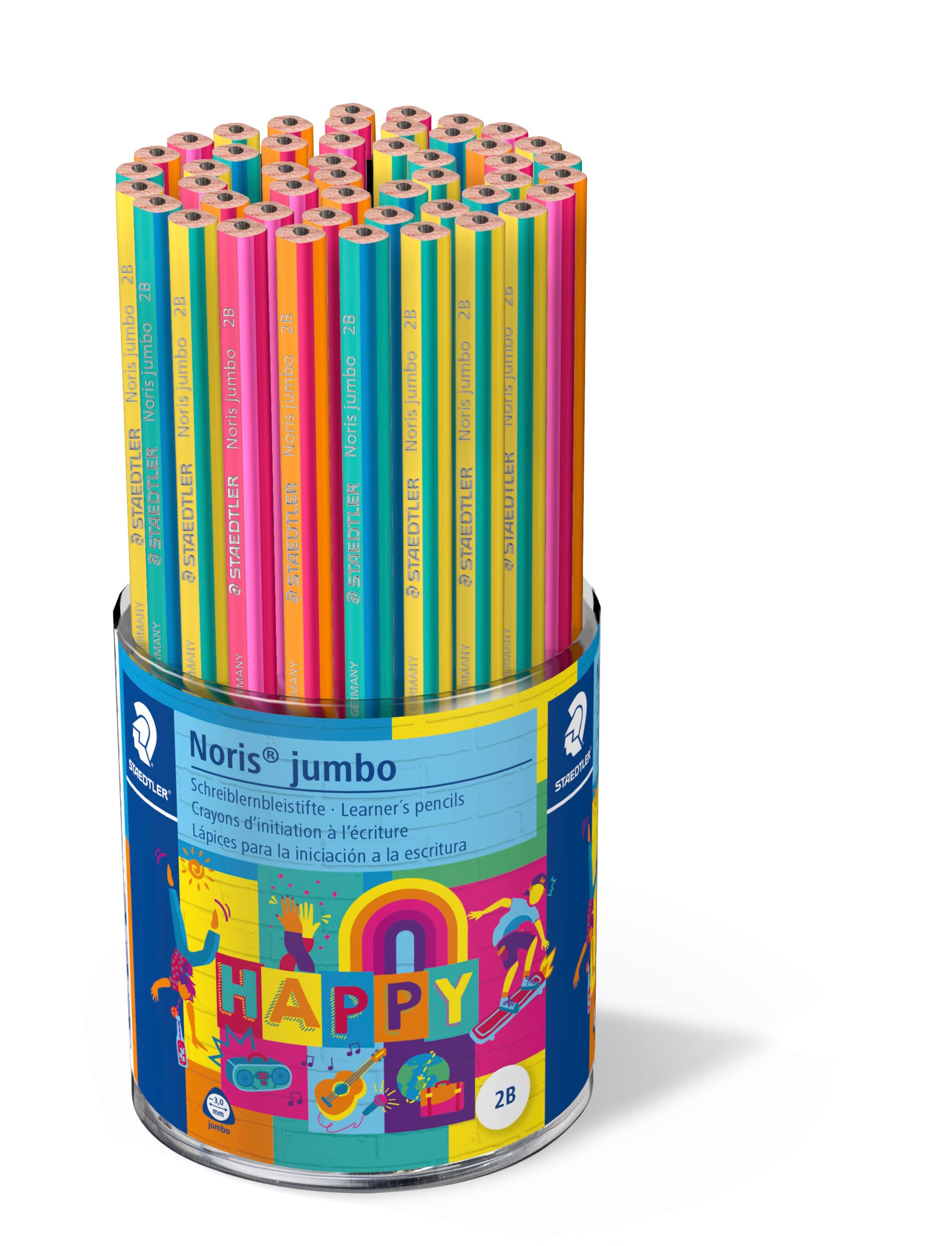 Crayons à papier aux rayures Noris colorées dans un étui dans les couleurs Happy : français vert avec cyan, jaune avec vert français, orange clair avec bordeaux, rouge bordeaux et violet rouge.