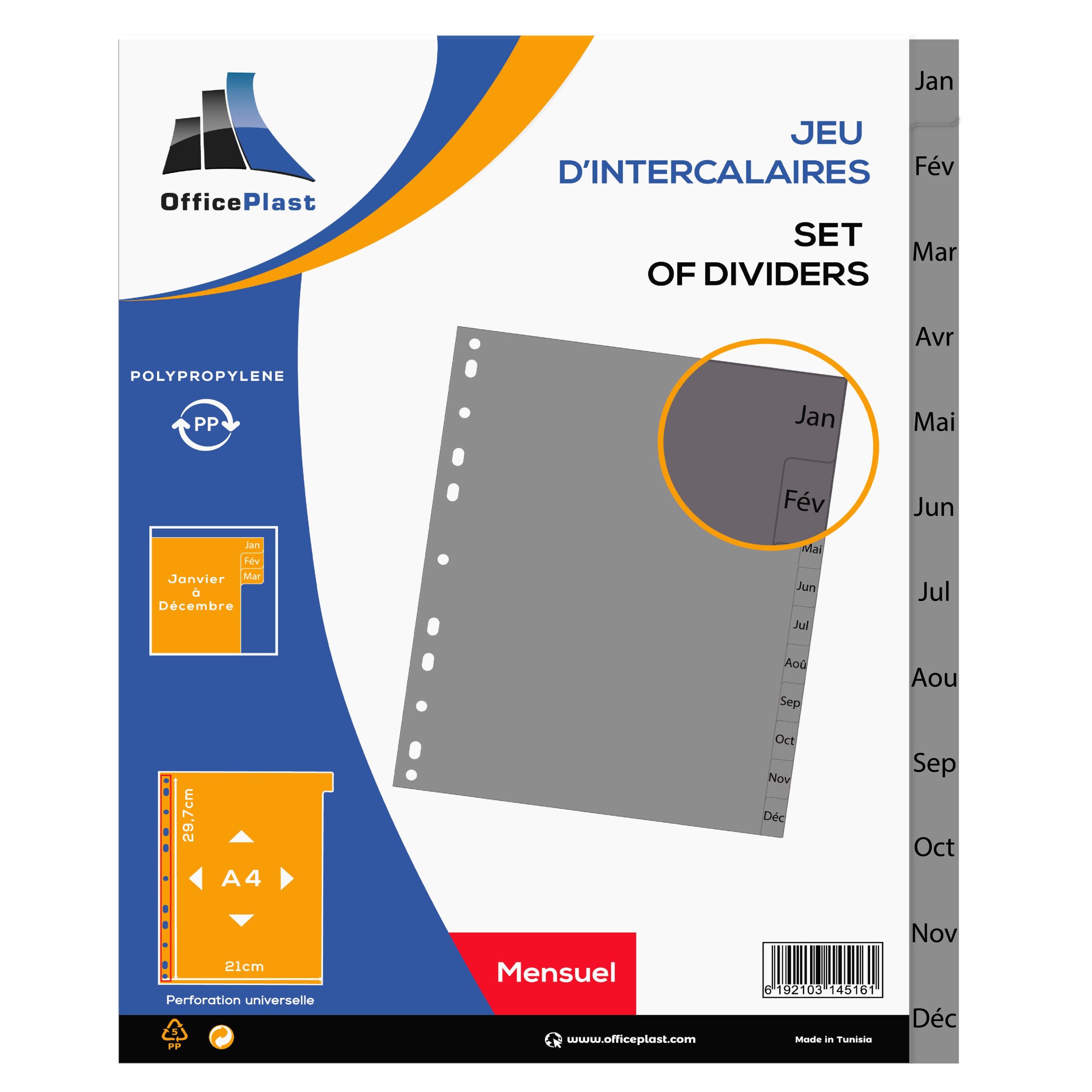 Jeux de 12 intercalaires Purple mensuel en polypropylène Format : A4 Perforation universelle : adapté pour touts types de classeur Divisons multicolores Encart de présentation + Étiquettes de personnalisation.... Descriptif