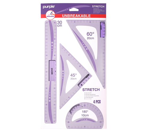 - Cet ensemble de 4 pièces, conçu en plastique incassable, comprend une règle, deux équerres et un rapporteur.