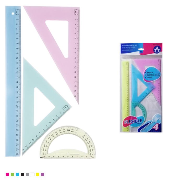 Pochette Géométrique ARK Flexible 4 Pièces - Matière: Plastique Souple, incassable Graduation imprimée avec une encre UV résistante Adaptée pour les Travaux Géométriques Ce set est composée de règle plate 30 cm... Descriptif